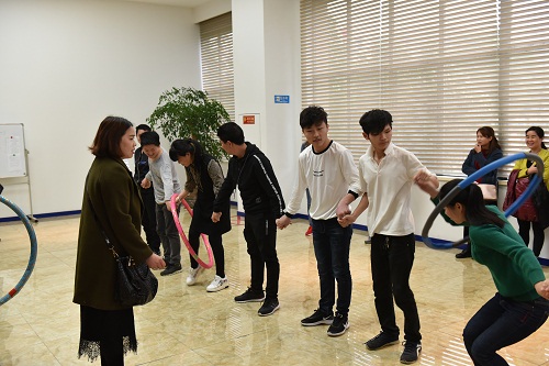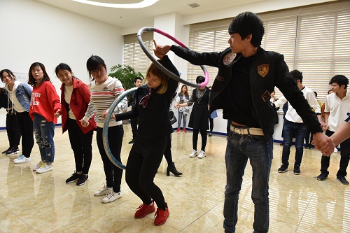 一个呼啦圈,将一个整体连在一起,除了牢牢牵牢双手的选手,尚有场外给他们助阵的众多“战友”,加油声、欢笑声在一楼大厅回荡……